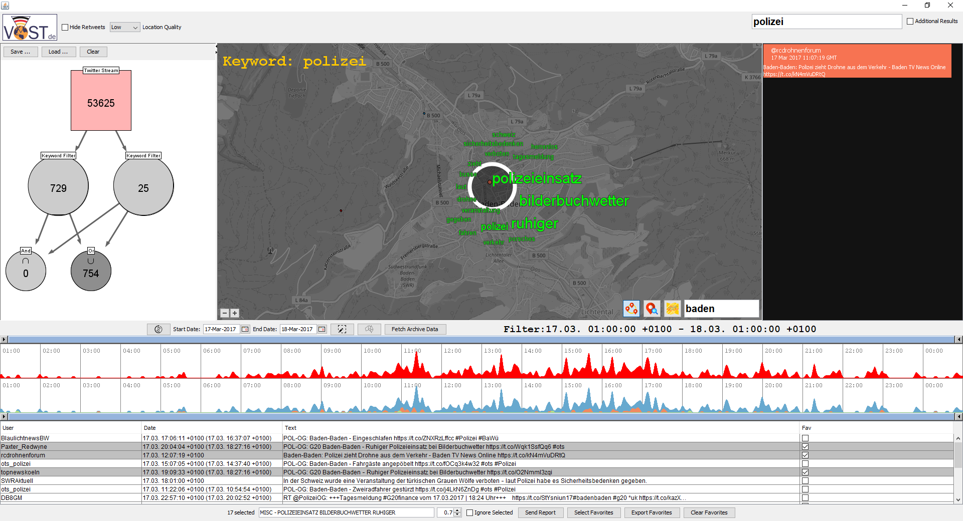 Two active members of this Virtual Operations Support Team are DFG-VGI members: Dr. Dennis Thom from the University of Stuttgart and Ramian Fathi from the University of Wuppertal (see Figure1). In their recent VOST deployments, they supported the VOST with a prototype of a Visual Analytics software for social media analysis that was developed at the University of Stuttgart and further adapted and advanced in the context of the DFG-VGI project (see Figure 2).